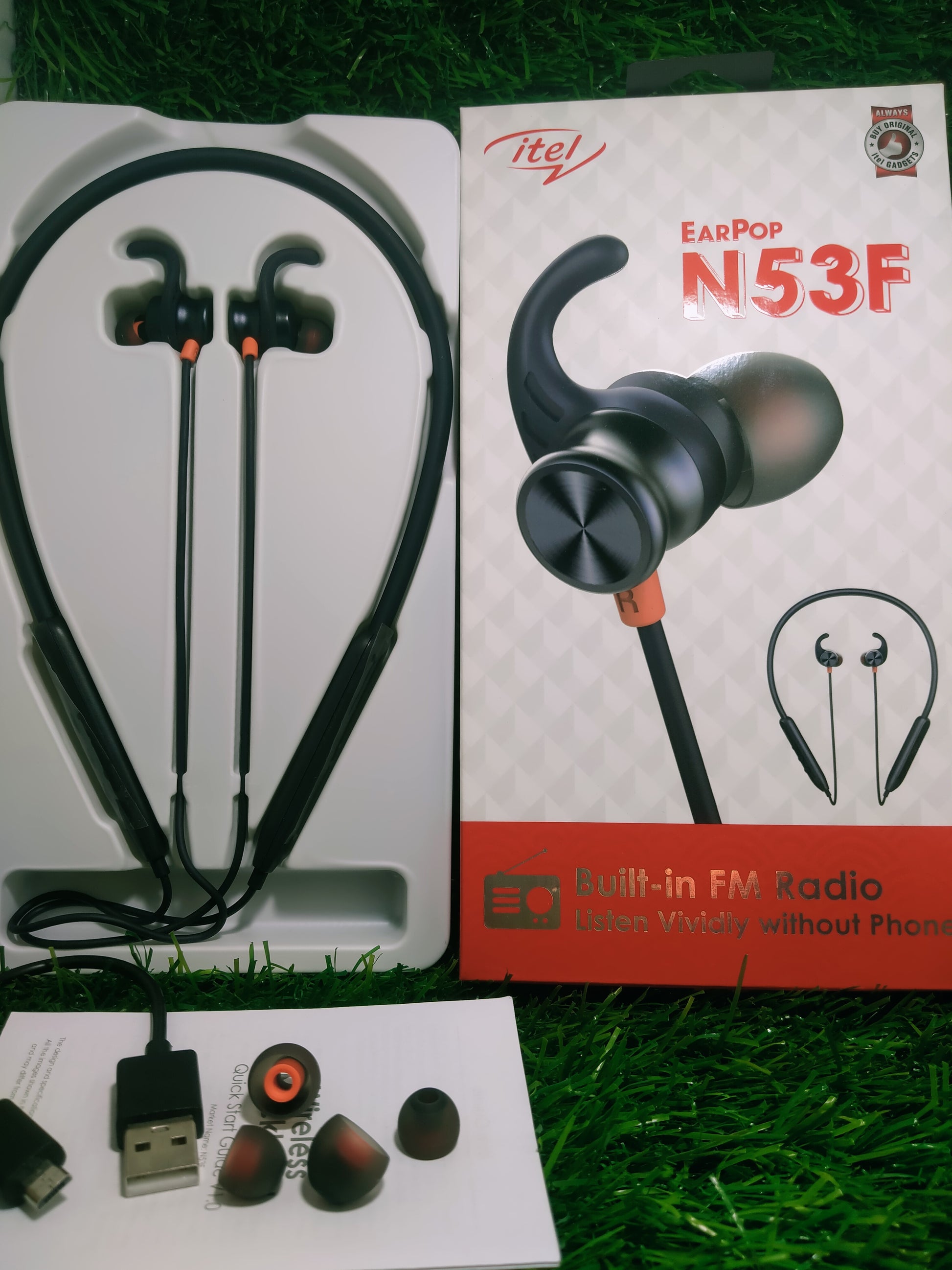 service Center warranty itel original, build in FM,EXTRA buds rubber and V8 mini charging cable